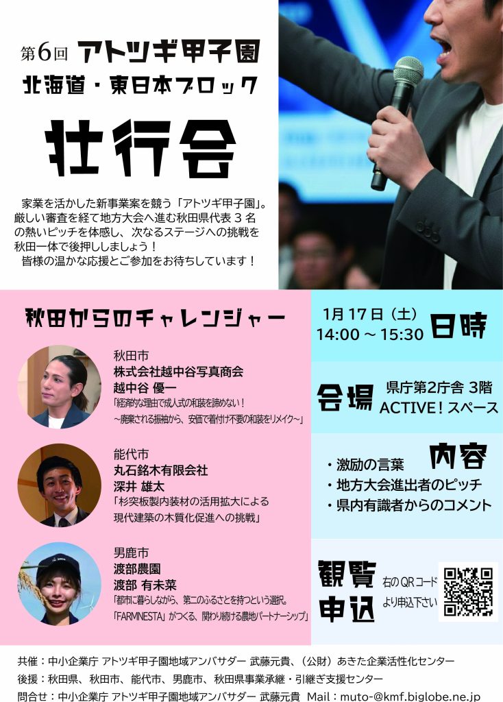 この度、中小企業庁が主催する「第6回アトツギ甲子園」において、厳しい審査を勝ち抜き、北海道・東北ブロック大会への進出を決めた秋田県代表3名の壮行会を開催いたします 。